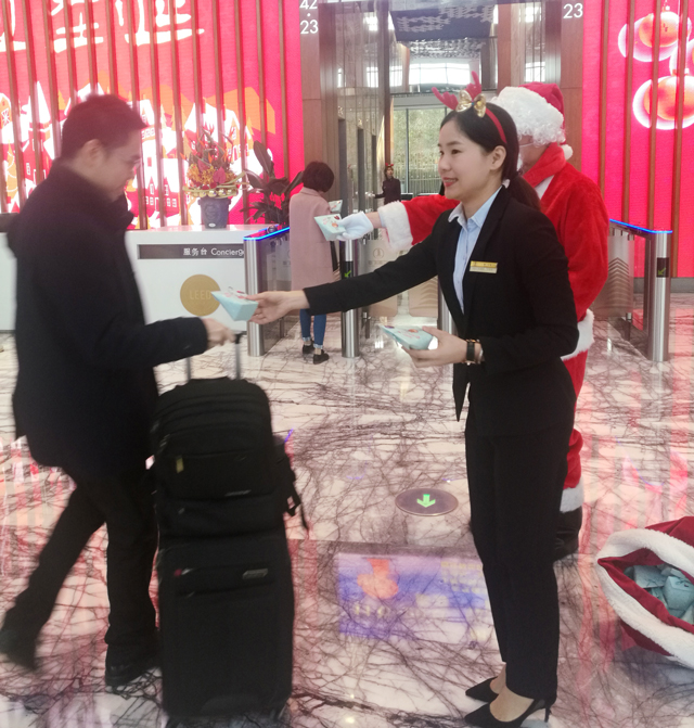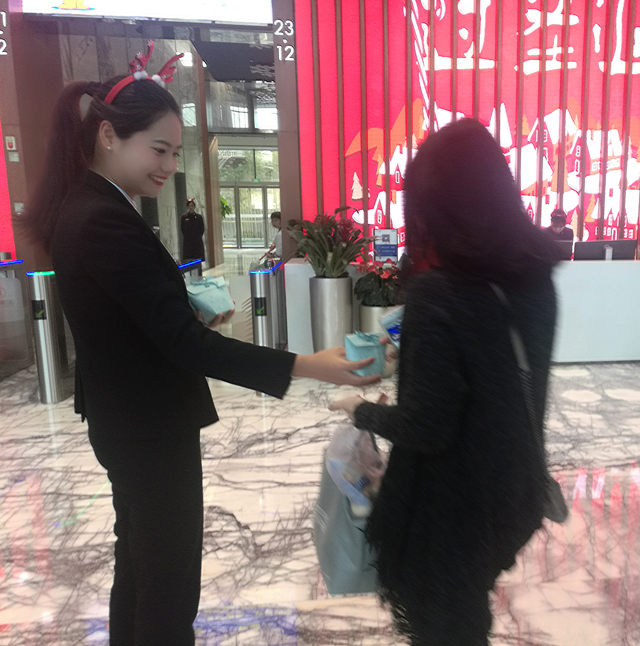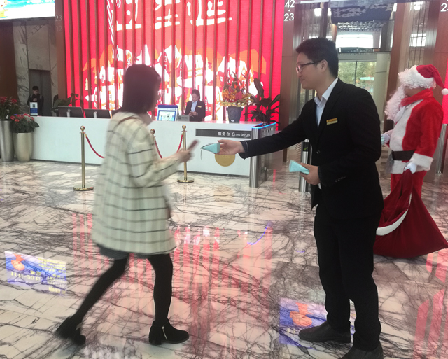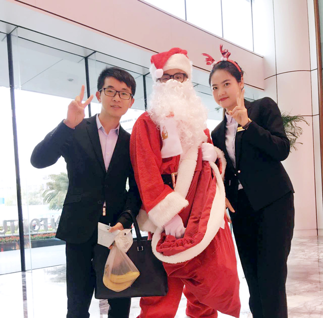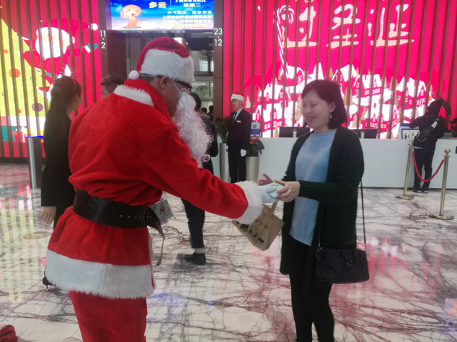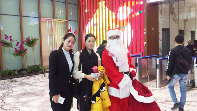 ? ? ? ? 為了感謝大廈租戶對財富中心物業服務中心工作的大力支持,讓租戶們度過一個快樂、美好的節日,2017年12月25日上午,財富中心物業服務中心的工作人員化身圣誕老人,穿著大紅袍,戴著圣誕帽,貼著白胡子,扛著裝滿圣誕禮物的紅布袋,一大早就來到西大堂等待著前來上班的租戶們,準備為大家送去精心準備的圣誕禮物。