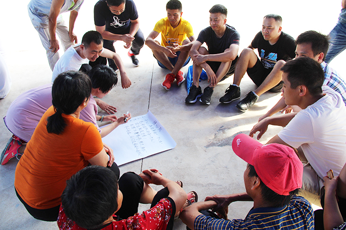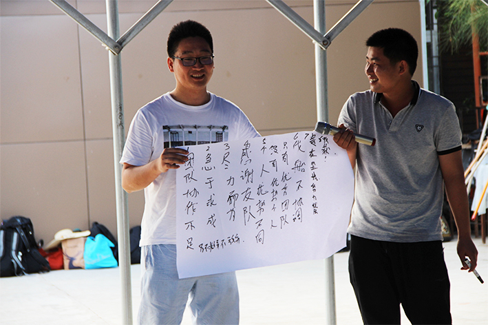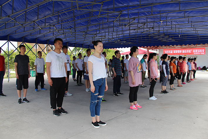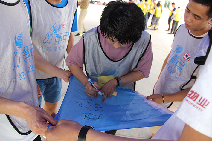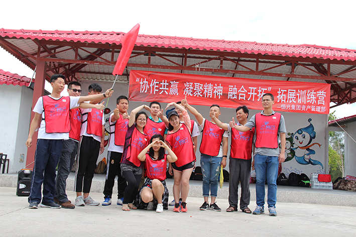 隨后,按照教練的指揮大家進入“團隊組建”分成了四個小隊,“恒心隊”、“戰狼隊”、“飛虎隊”、“好漢隊”……每個隊通過取隊名、想口號、選隊歌、擺造型來各自進行展示,拼士氣、展風采,這是促進員工間溝通交流,增加彼此了解的熱身活動。緊接著充滿挑戰性的拓展活動開始了,各隊開始根據教練發放的任務展開激烈的比拼,“神筆馬良”所有隊員各自拉著一根綁著大毛筆的繩子末端,在不接觸毛筆的情況下完成各自隊名的書寫,培養團隊協作能力。