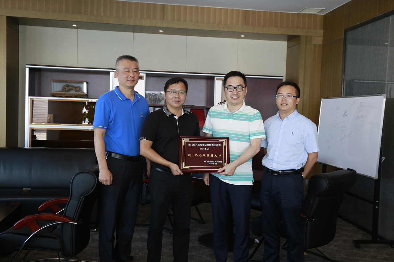 近日,中共思明區(qū)委、思明區(qū)人民政府授予了廈門恒興濱海置業(yè)有限責(zé)任公司“2017年度超1億元納稅特大戶”稱號。7月24日,思明區(qū)濱海街道副主任鐘振榮和書記蘇永昌來到財(cái)富中心42樓,將納稅大戶牌匾和紅頭文件送到了恒興集團(tuán)總裁王偉文的手中。