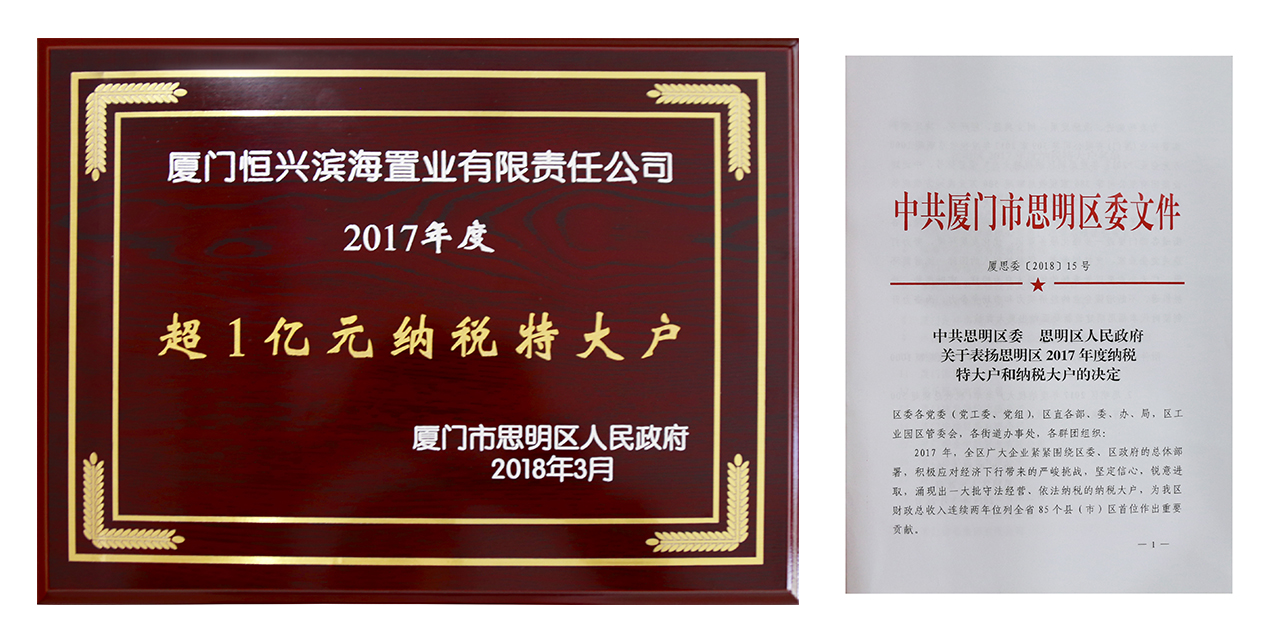 據(jù)悉,“納稅特大戶”稱號授予的是年度稅收總額1000萬元以上的企業(yè),2017年度思明區(qū)獲得此稱號的共有309家,廈門恒興濱海置業(yè)位列第22名。