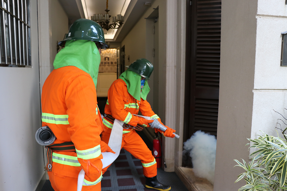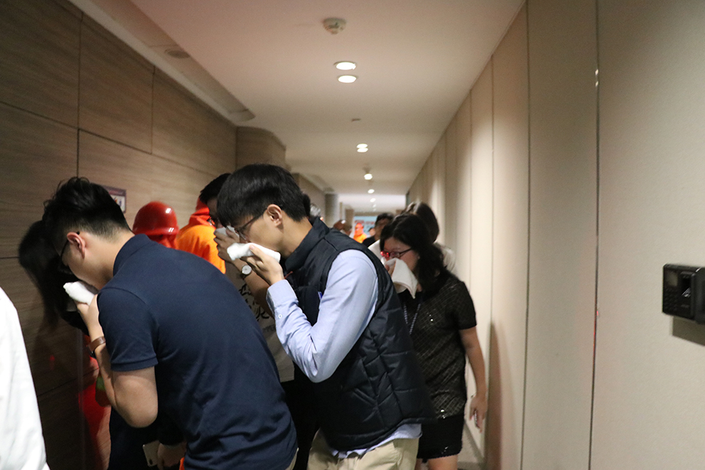 隨著演習煙霧彈被拉開,煙霧迅速彌漫,廈門財富中心消防演練正式開始,大廈火災自動報警系統探測到大廈7層出現大量火警信號,中控室值班員確認火警后立即上報,現場啟動大廈火災應急預案,啟動消防廣播,通知各應急小組就位,滅火組維序員身穿防護服進行滅火器、消火栓使用演練;疏散組有序的引導樓層人員通過消防安全通道撤離到大廈地面廣場的安全地帶;整個消防演練都進行得有條不紊,全體參演人員行動迅速、紀律嚴謹、演練認真到位。