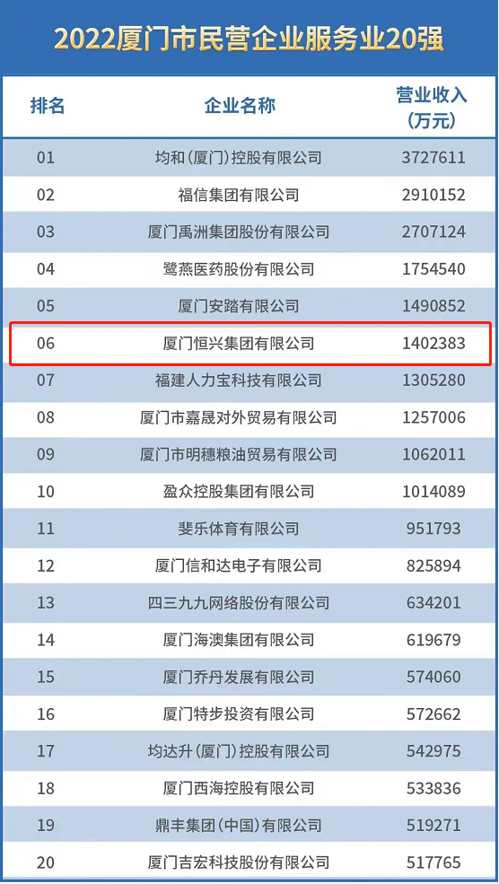 廈門恒興集團有限公司入榜“2022年廈門市民營企業百強”,位居榜單第10位;入榜“2022廈門市民營企業服務業20強”,位居該榜第6位。??